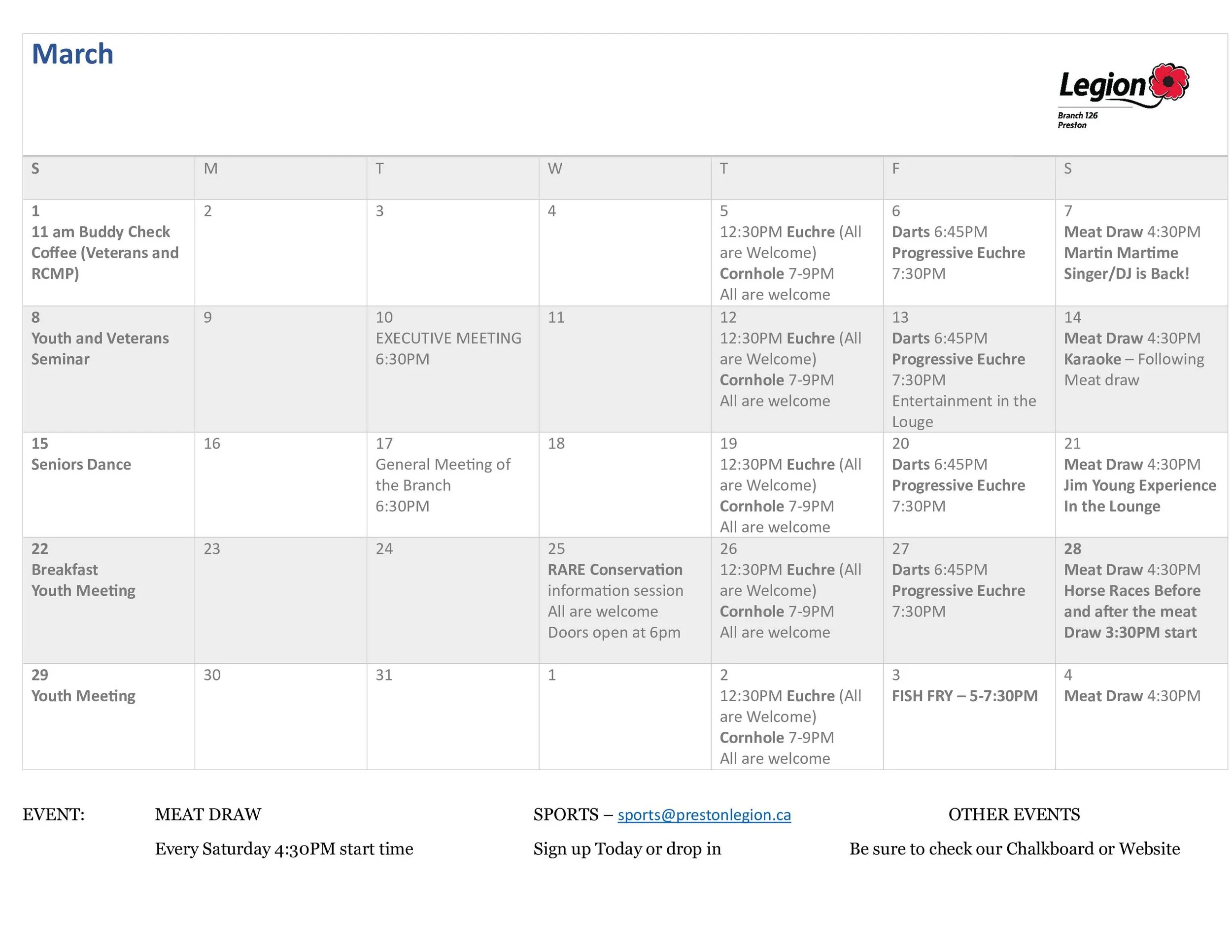 I would like to thank you all that are coming out and supporting our sports groups. If there is anybody interested in summer sports groups; horseshoes; cribbage or any other sports already listed and new ideas Please contact Sports@prestonlegion.ca Hope to see you soon.